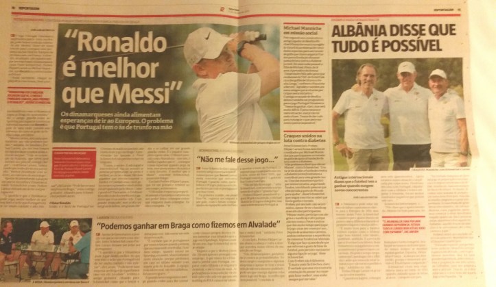 Både Schmeichel og ”Manne” var faktisk på besøg i Lissabon i sidste uge. I landets store sportsavis Record, med et dagligt oplag på 50.000, var midtersiderne i tirsdagsavisen prydet af et billede med dem begge to plus Preben Elkjær, der for andet år i træk havde været i Lissabon i forbindelse med en velgørenhedsturnering i golf arrangeret af Michael Manniche til fordel for Diabetesforeningen, idet hans datter er diabetiker.